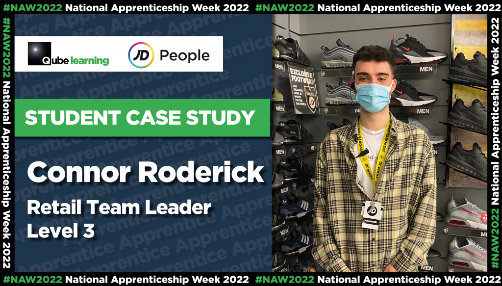 Connor told Qube: ‘I have been in the JD Sports Group for nearly three years and the Apprenticeship programme will help in my future goals. My favourite part is the fact that I am finding out so many different things about leadership/management and learning about so many different aspects that come along with businesses.’