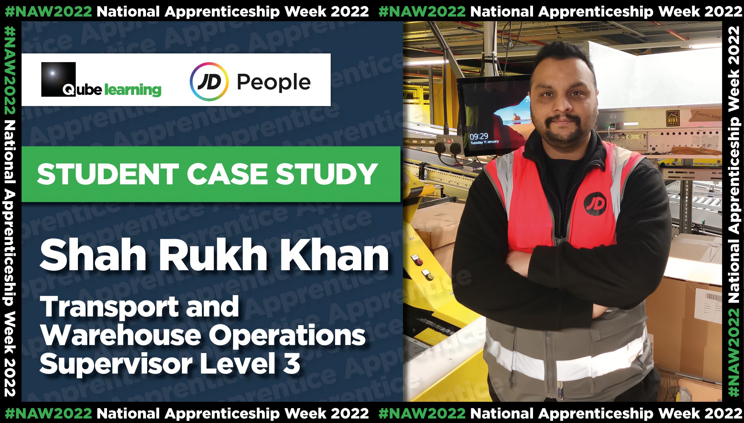 Shah Rukh told Qube: ‘I started my first job in the UK with JD Sports in 2018 as a Warehouse Operative, and was promoted to a Supervisor in 2021.’